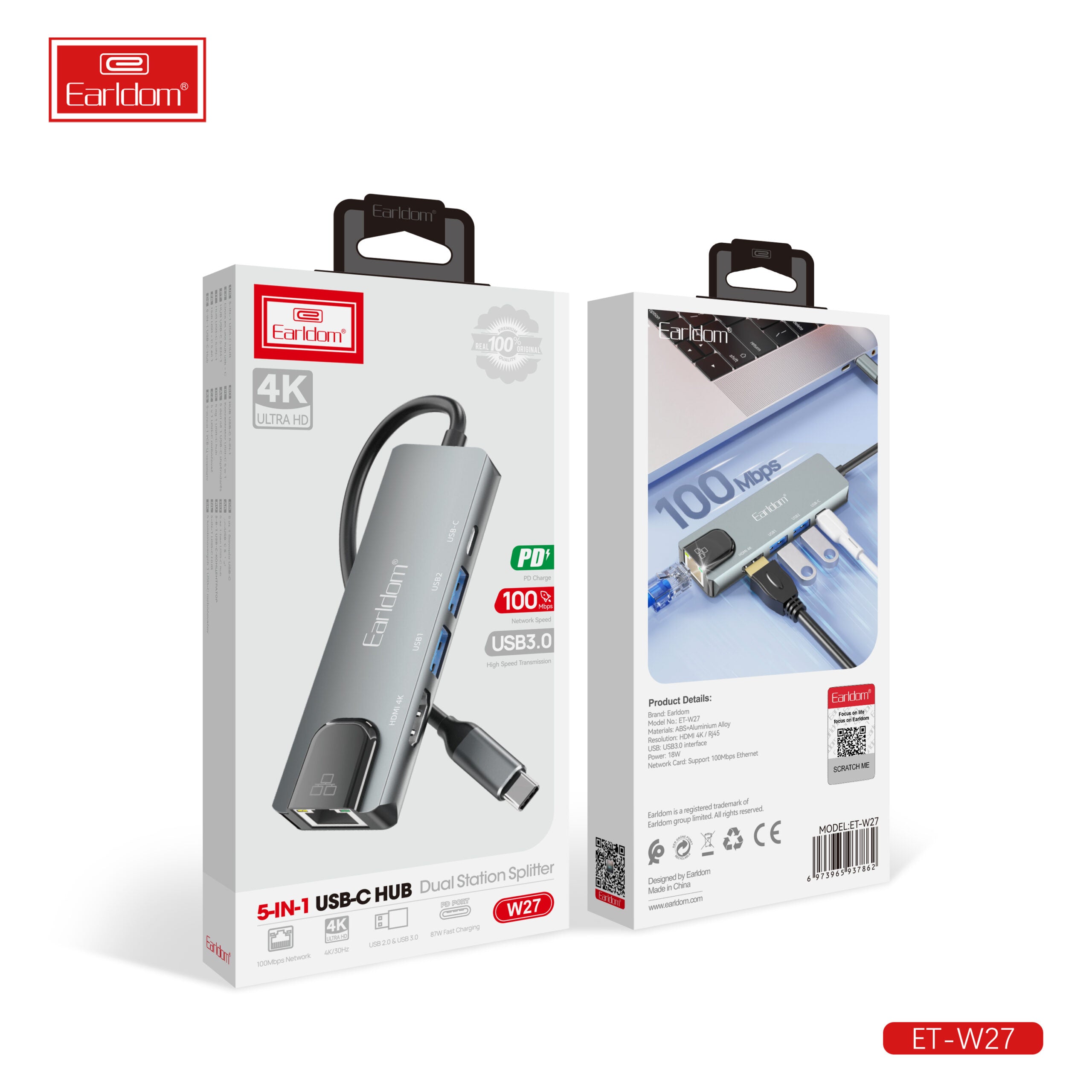 Earldom Hub USB-C 5 en 1, double station de répartition, câble HDMI et NW, gris W27