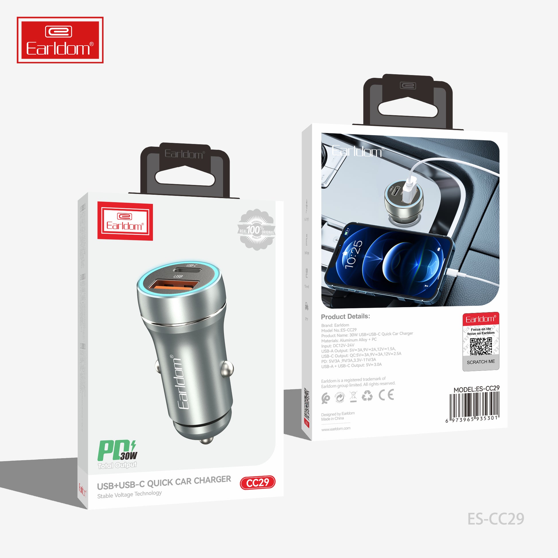 Chargeur de voiture rapide Earldom USB+USB-C 30 W gris sans câble CC29